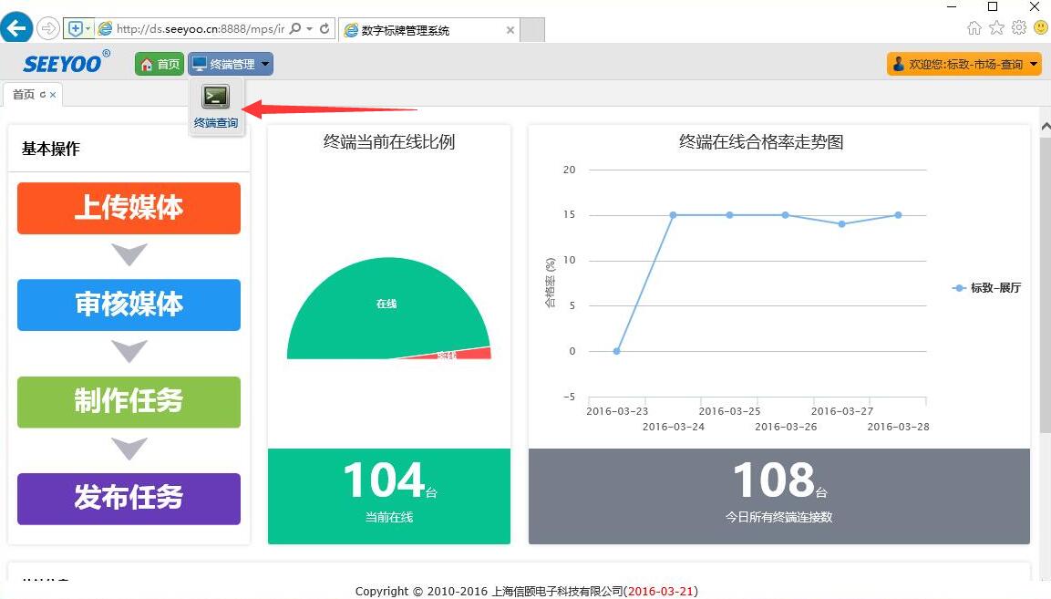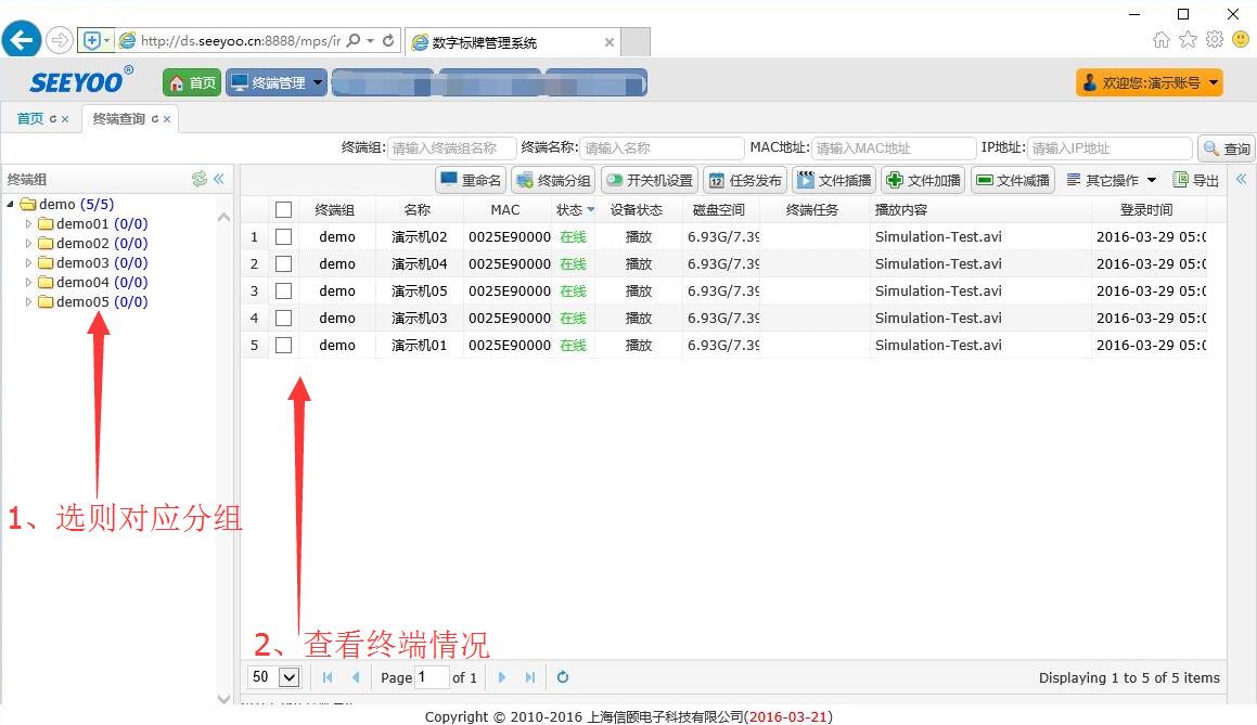 4、在左侧树状目录里选则相应目录,右侧可查看终端在线情况。