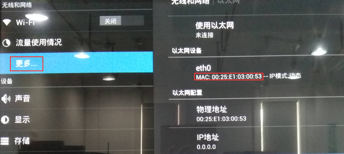 8、如使用有线方式联网,则在”wifi”选项里,将wifi关闭。并在”更多”选项里,将“使用以太网”复选框勾选。重复步骤6和7。