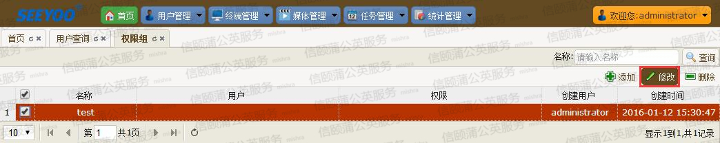 点击上方用户管理菜单中权限组,在右侧可输入权限组名称,点击查询可以查看系统存在的权限组及权限组的基本信息。