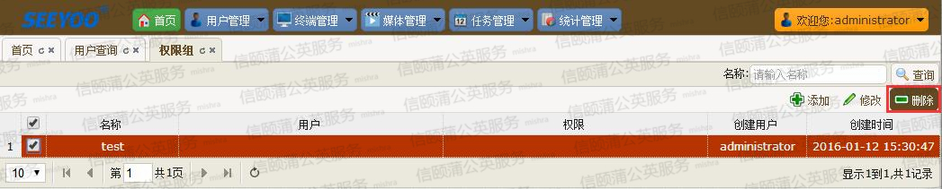 选中某个需要删除的权限组,点击删除按钮,可以对该权限组进行删除。如下图: