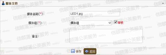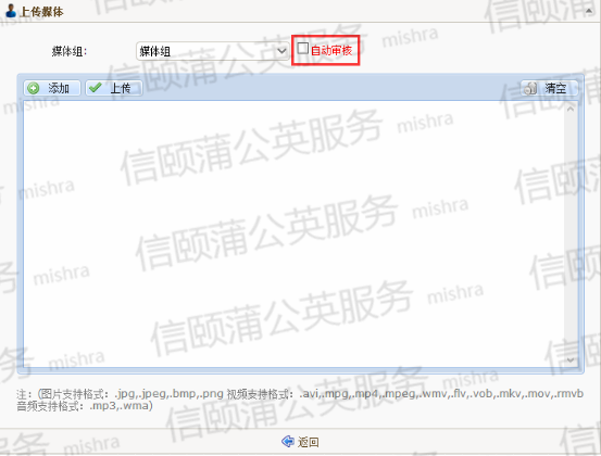 2.点击上传媒体可将所需的媒体文件上传至服务器,上传时可选择相关媒体组,点击自动审核可对上传的媒体文件进行自动审核。