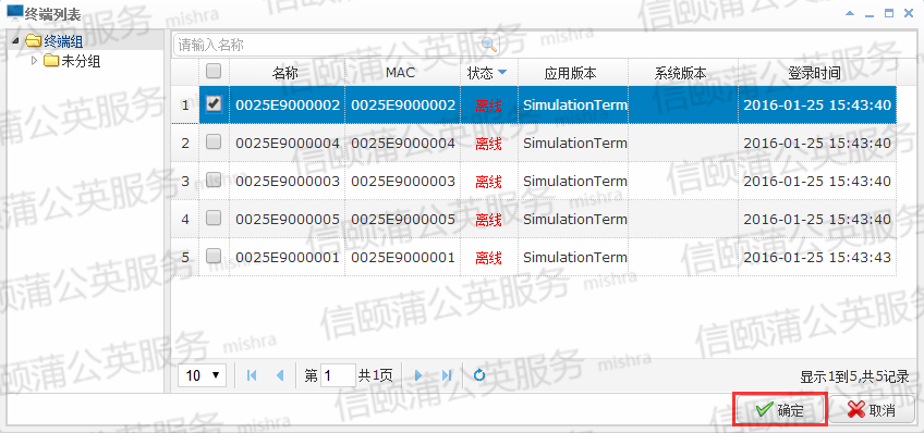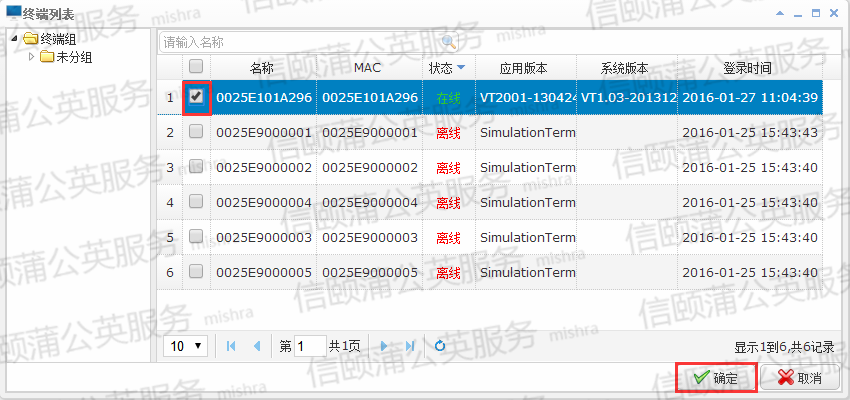 3、在弹出的终端列表框内,找到所需要查询的终端,并在此终端前面的勾选框内点击,即可选中该终端。然后点击下面的确定按钮,即可查询选中终端的相关日志。