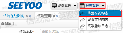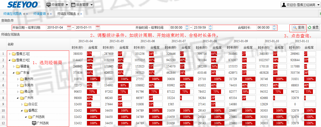 1、点击:报表管理->终端在线报表。点击左侧终端组按钮,在终端组内按大区->省->市->区县->经销商,找到自己4S店,在右侧可看到终端详情。